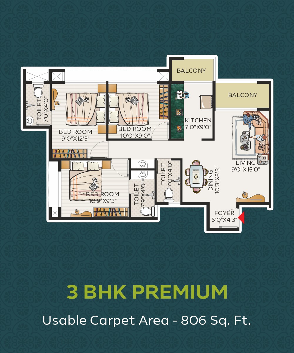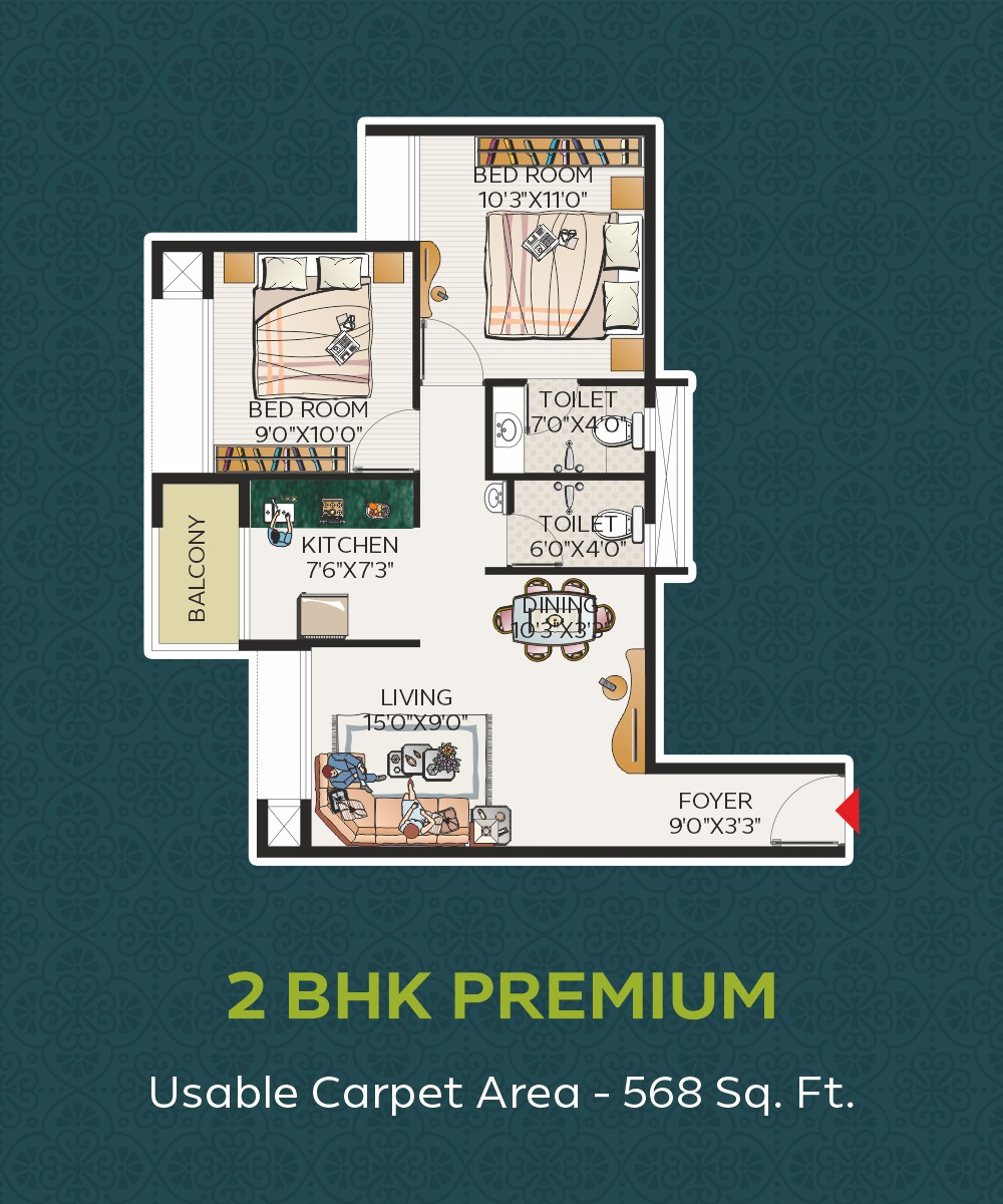 • Main Door and Bedroom Door with decorative laminate sheet and premium quality hardware.